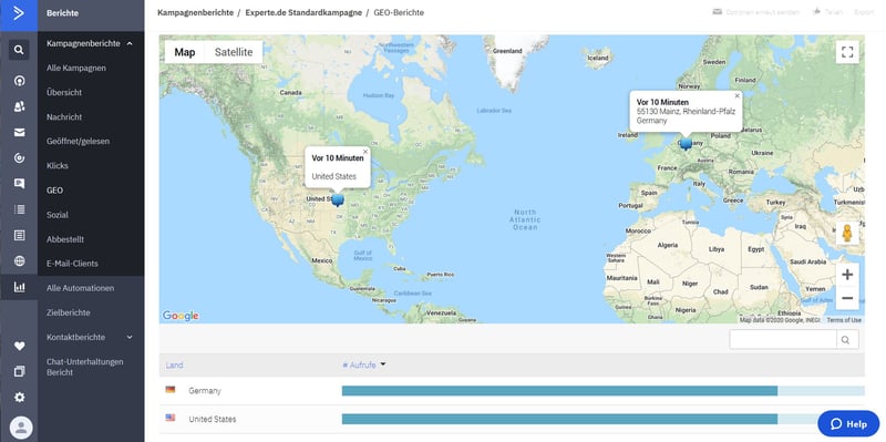 Each individual metric (such as bounces) can be clicked on and expanded, providing you with even more information (for example, bounce behavior). ActiveCampaign converts soft bounces into hard bounces if delivery fails on three separate occasions, ceasing future delivery attempts. Through the menu bar on the left, subscribers to all packages can view additional information about the click behavior of their recipients, as well as comprehensive geo-tracking data, so long as it has been activated for the campaign in question.