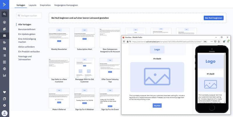 ActiveCampaign's design templates, including the mobile device and desktop previews.