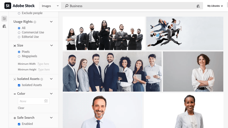 Business: It isn't a big surprise that such an all-encompassing term yields almost 20 million images. By checking the boxes next to vector graphics and illustrations, this more than doubles to 44 million. At times like these, filters are an absolute necessity. Unfortunately, limiting search results to only those with people in them didn't work particularly well. Likely, this is because business without people is hard to visualize.