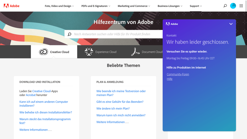 On the page's footer, you'll find a link to the provider's help center. Clicking on this will open an external page titled "Adobe's Help Center". Select Support from the menu, and you'll finally find contact options. Once again, outside of the provider's operating hours, these are limited.
