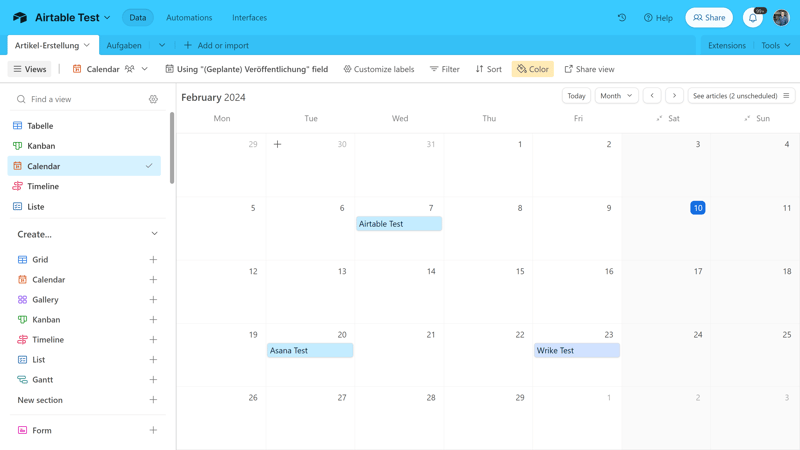 Beaucoup de choses sont possibles avec Airtable. Vous pouvez créer des bases de données personnalisées, gérer des projets et leurs tâches et automatiser les flux de travail. Vous pouvez visualiser, filtrer et regrouper de grandes quantités de données et utiliser différentes vues, comme les vues Gantt et Kanban, pour examiner les données sous différentes perspectives. À cela s'ajoutent de nombreuses autres fonctions, comme un éditeur de formulaires, des rapports, des automatisations de flux de travail ou la construction de tableaux de bord visuels.