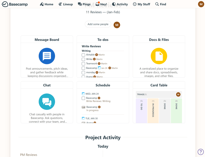 Basecamp's “greatest hits” approach certainly delivers a user-friendly experience: by the time you master the basics of a more complex tool, you could already have five projects set up on Basecamp, complete with tasks and content. This makes it especially appealing for smaller teams and straightforward projects, offering a compact, intuitive, and hassle-free experience.