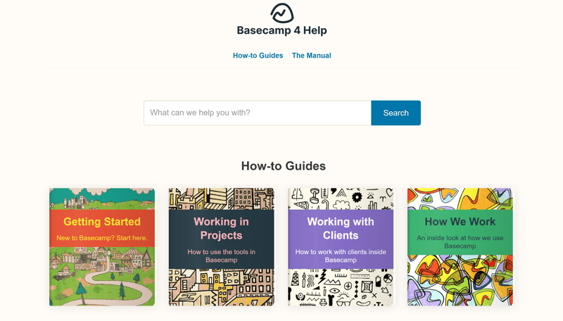 Basecamp also offers a traditional help section with guides accessible directly from the dashboard via a question mark icon. Here, you'll also find video tutorials, webinars, blog articles, and a support forum.