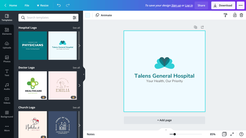 But don't worry, you'll have plenty of templates to start from. Click on "Templates" in the menu off to the left that you use to switch between the editor's different features and tools. The platform offers a huge selection of templates, sorting them by branch, including "Hospital logos", "Food/drink logos", or less common categories like "Church logos", and "DJ logos". We even found templates for animated logos, which were unique in our sample.