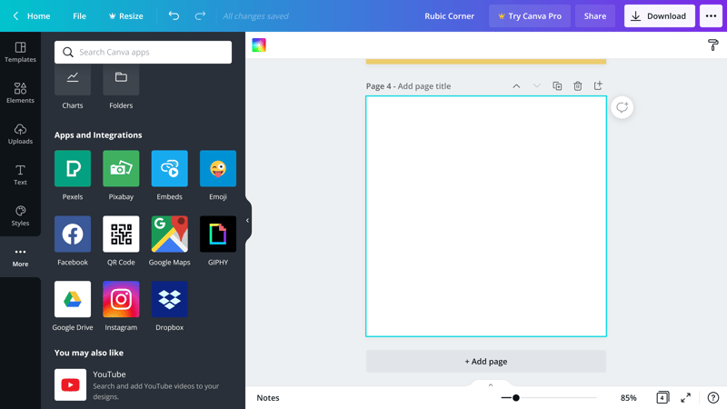The "Styles" tool is also worth checking out. Compared to its competitors, Canva's editor is fairly complex. You won't be able to automatically apply a layout to each template, however, you can load pre-made color combinations. Simply save your brand's colors, and they'll be available for any graphics you decide to make with the platform.