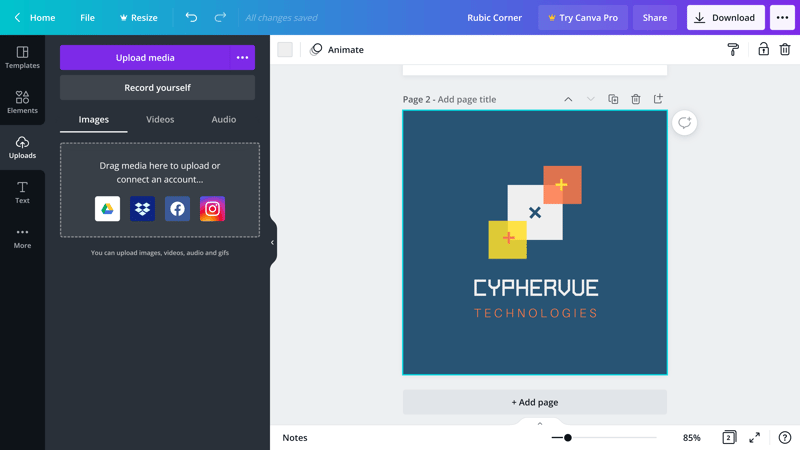 As mentioned above, to the left of the editor's menu, you can select between different templates and tools. For lines, shapes, frames, diagrams, and audio or video files, click on "Elements". You can upload your own media by clicking on "Uploads". It's even possible to integrate other services, like Instagram, to access photos. Once again though, these features are more relevant for presentations than logo design.