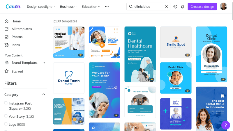 The quality and quantity of templates offered by Canva are awe-inspiring. Whether for creative purposes, social media, or work presentations, you're bound to find whatever you need. Since the platform's search filters are few and far between, the only question is, how long it will take you to do so?