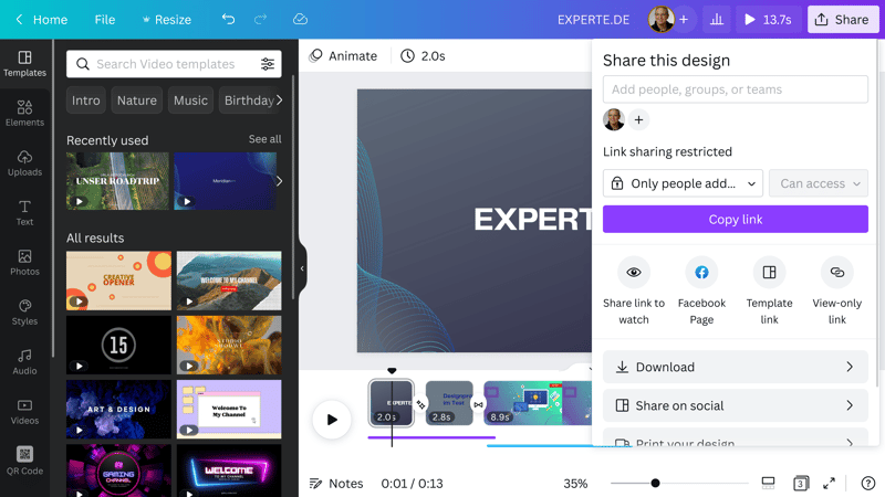 On Canva, you can also create top-of-the-line videos and animations, cutting your own material in with the high-quality stock videos that come with its Pro version.