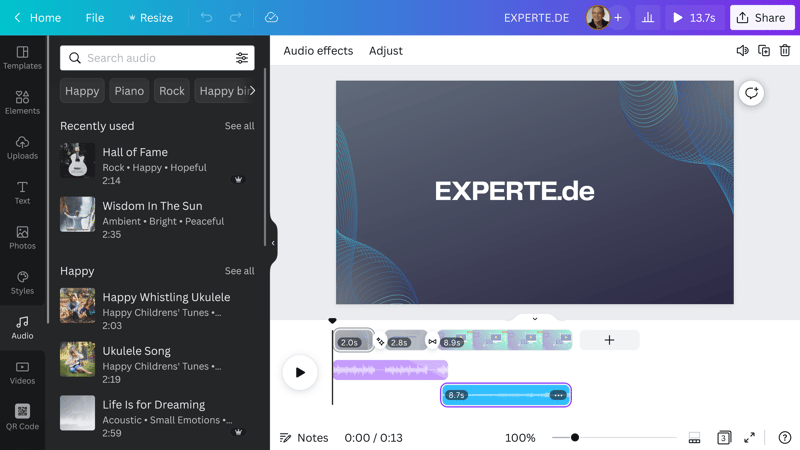 With Canva you can easily compile professional-looking videos, complete with smooth transitions, intros, end credits, and background music.