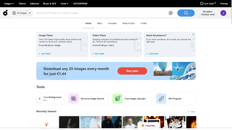 The platform's homepage is compact. After you're logged in, a small header highlights the newest pictures added to the service's database. Below, there's a search bar that you can use to find what you're looking for by specifying the type of media, inputting a word or phrase, or performing a reverse image search. Underneath, you'll see your dashboard, where you can manage your account, review your purchases and downloads, and add or remove favorites. Scrolling down, teasers showcasing different collections, subscription plans, popular search requests, and contact information for the provider's support are offered.