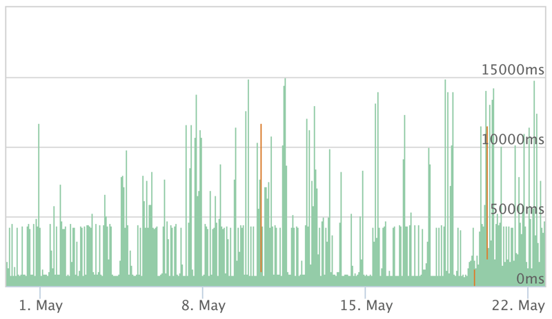 We measured TTFB with a disabled cache over the course of six weeks to find out whether there were any fluctuations or significant discrepancies. The graphic below shows the results (the slowest response time per hour):