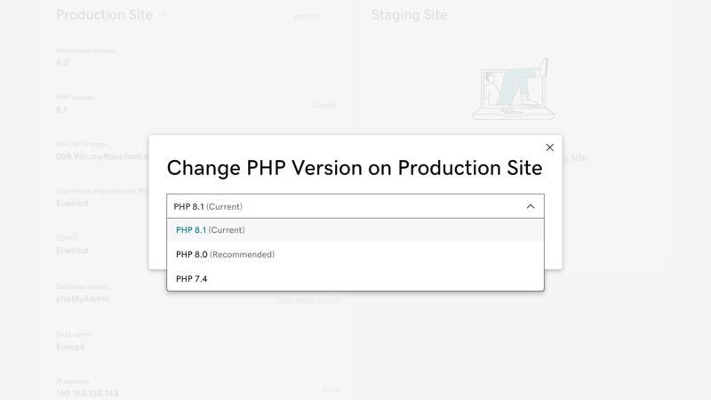 As of the time of testing, GoDaddy supports PHP up to version 8.1 (but not the newest version, 8.2). It's possible to change your production website's PHP version to a previous one, however, there aren't any additional options.