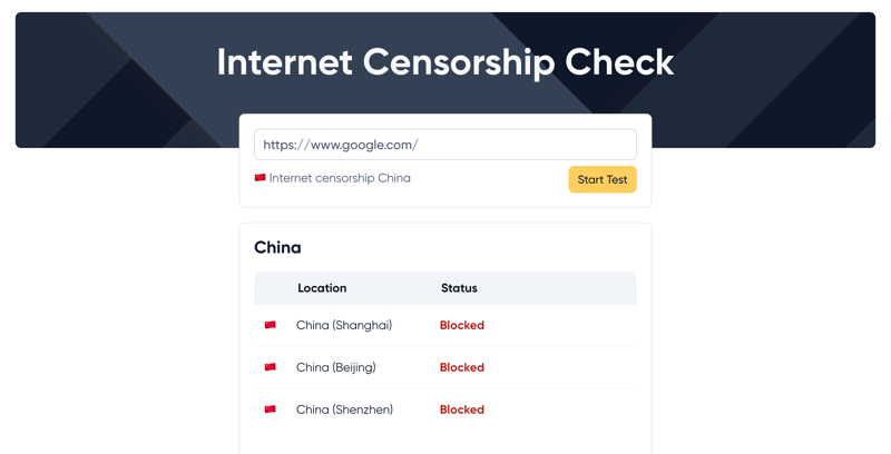 First, let's verify whether or not Google is actually blocked in China. EXPERTE.com's internet censorship check can help; we use our servers in Beijing, Shanghai, and Shenzhen to test if websites are available from inside the country. Simply input a URL into the search field and click on the "Start Test" button. Within a few seconds, you'll discover whether or not the site is available in China.