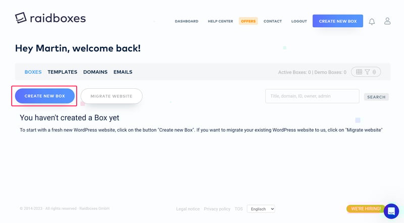 Step 2: Once you've activated your account, you'll be directed to the Raidboxes dashboard. You can also log in using your new account details. To start a new WordPress project, click on the blue "Create New Box" button.
