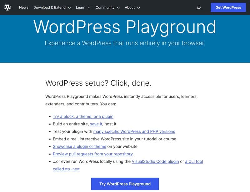 If you want to quickly try out a particular feature, theme, or plugin, or just play around with the WordPress dashboard for a bit, you can use WordPress Playground. Accessible directly in your browser, it requires no downloads or account creation.