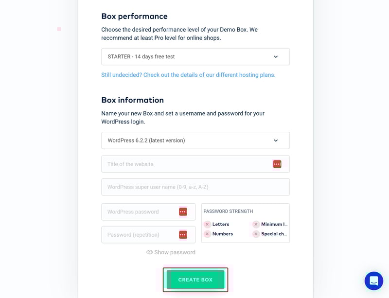 Step 4: Once you've filled in all the required information, click on the green "Create Box" button. Raidboxes will now set up your WordPress installation for you.