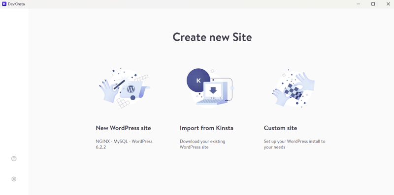 Step 6: In DevKinsta's main menu, you have three choices: create a new WordPress site with preset parameters (NGINX, MySQL, Version 6.2.2), download and edit an existing site from Kinsta locally, or configure a custom site.