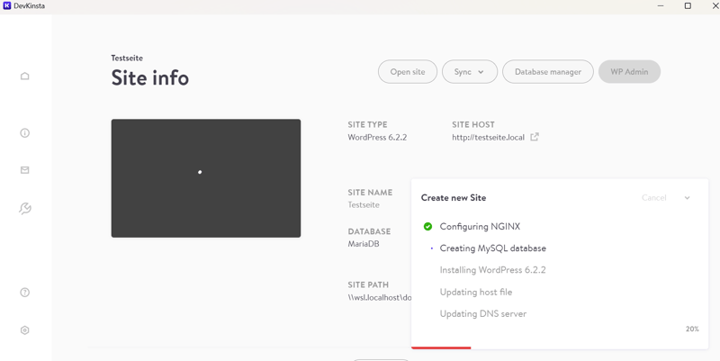 Now you can switch over to your WordPress dashboard and adjust settings or edit your WordPress test site by adding pages or entries.