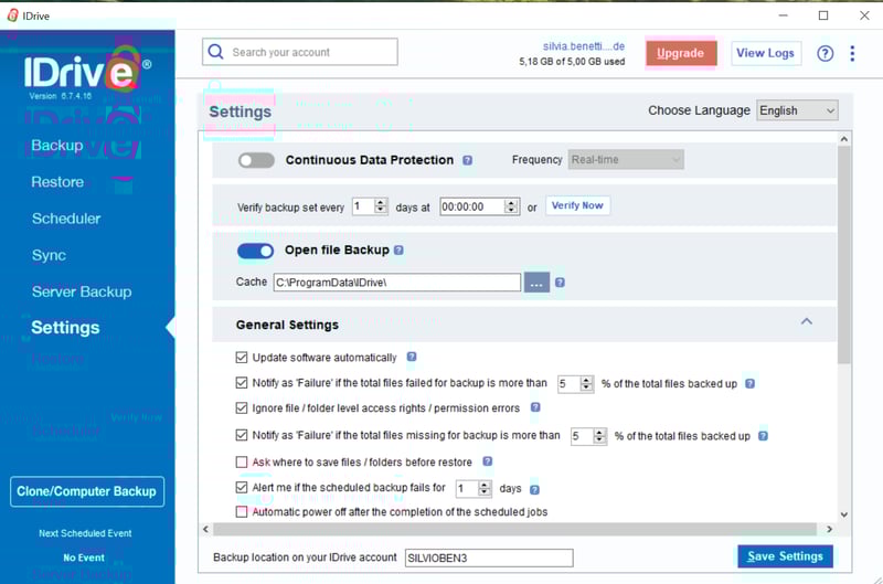 IDrive is compatible with Windows, macOS, and Linux, as well as Android and iOS. Under settings, you can specify how you would like to secure your data: