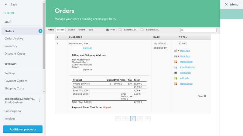 Jimdo Creator divides orders into active and completed ones, the latter of which are stored in an archive. You can filter your orders based on different criteria or search through them. By clicking on an order, a detailed view will open, displaying invoice and delivery address information, as well as a handful of actions. For example, you can mark an order as paid or sent, or even send an email to the customer.