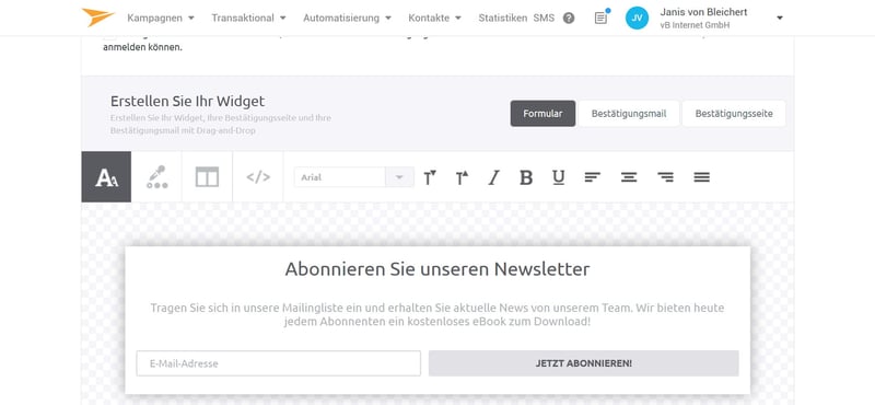 Using forms, you can effortlessly add contacts, including not only their email addresses, but also additional data like their name, birthday, and physical address. Under Contacts select Subscription Widget to easily integrate a unique widget on your homepage. If desired, you can also create an integrated pop-in widget with individual fields. In the appropriate editor, all elements from a call-to-action (CTA) button to a confirmation page can be created and modified.