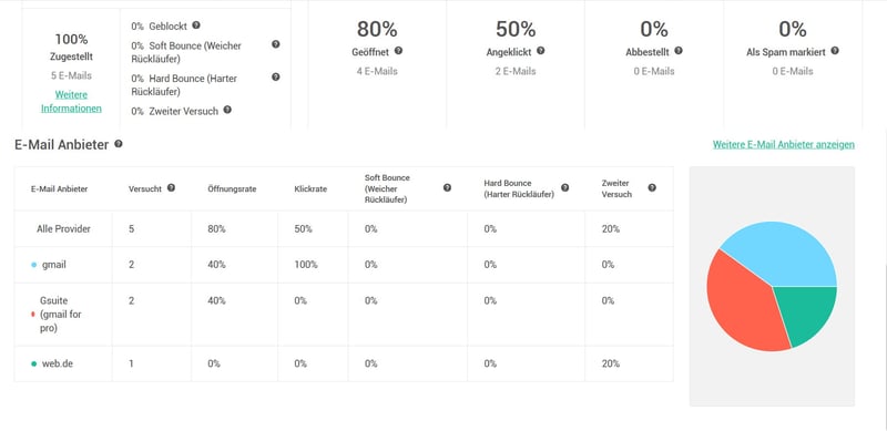 Among the metrics available, you can view the delivery rate, as well as the percentage of opened messages, clicked links, cancellations, spam markings, and both soft and hard bounces. The percentage of emails with multiple delivery attempts can also be viewed. Beyond that, Mailjet also offers a detailed overview of the different email providers used by your recipients and the number of bounces or blocks from each.