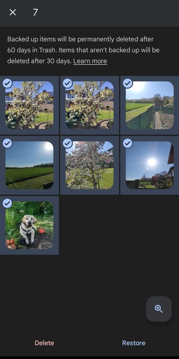 Now, you can see any photos that you might have deleted by accident. Should you have backed up the deleted photos to the cloud, they'll be automatically removed after 60 days. Images that weren't previously backed up to the cloud are only kept for 30 days before they're gone forever.