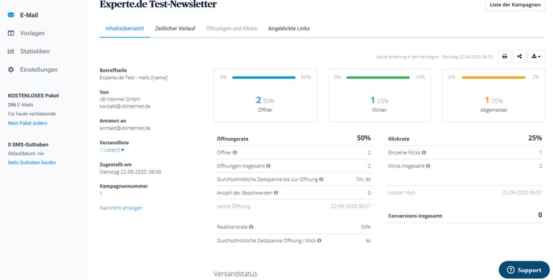 On both the overview page, as well as in the Campaigns area, you can gain detailed insight into your campaigns. These exportable statistics include information on the open and click rates (the latter of these is a premium feature) as well as how often links are clicked on, how much time is spent reading through your mailing, and much more. So long as you've enabled it beforehand in the API, you can also view the conversion rate here as well.