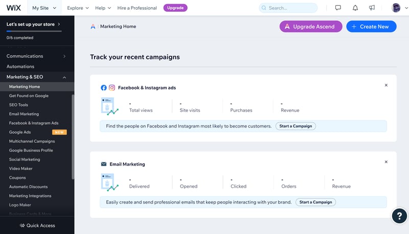Of course, you can only start selling when customers know what you have to offer. This is where marketing features can play a major role, elevating the work you've done on designing and stocking your online store. Wix offers a powerful marketing platform called Ascend. In addition to coupons and discounts, you can also engage in email marketing, use SEO tools, and even create high-quality promotional videos and social media posts.