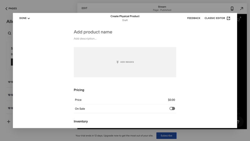If using Squarespace, you'll add an online store to your website as a new page through the main menu. After that, you can manage your physical and digital products or services, with a number of options provided. You can tag and categorize your good and create product variants.