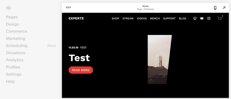 Squarespace's user dashboard consists of two parts: The navigation menu is to the left, providing access to the page menu and design options, settings, and the e-commerce, marketing, and statistics sections. To the right of this, a preview of your homepage is displayed that you can adjust by clicking on the "Edit" button in the upper left.