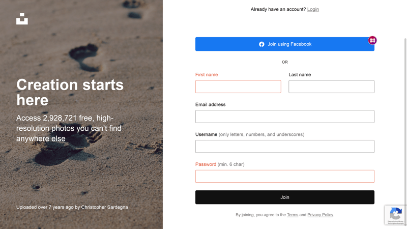 You can sign up with Unsplash easily via email or your Facebook account. It is possible to download images without an account.