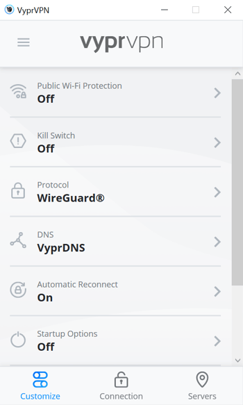 The support center can be accessed through the hamburger menu on the interface's upper left along with information about available updates. Settings are found below, in the main menu, under "Customize". It's possible to activate the kill switch here and to configure auto-start options, protocols, and a DNS server, but more on all of that below.