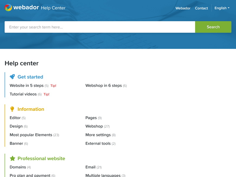 Vous pouvez accéder au centre d'aide en cliquant sur le bouton bleu Aide dans le menu Webador. Vous y trouverez des instructions réparties en différentes catégories ainsi qu'une fonction de recherche. Les instructions elles-mêmes sont efficaces et démontrent les fonctions de manière visuelle à l'aide de GIFs et de captures d'écran.