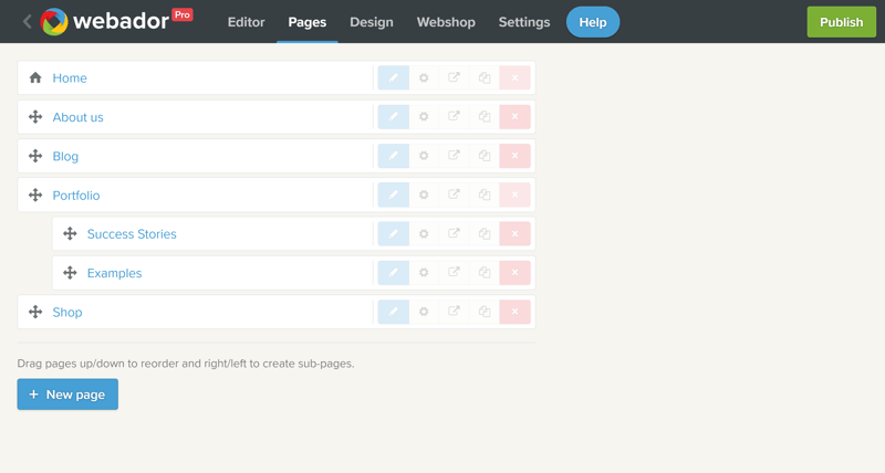 You can add new pages to your website and specify its hierarchy, by moving pages and subpages to the left or right in the Pages area. Nifty: The hierarchy can be extended as far down as you'd like, adding sub-menus to sub-menus. It's also possible to configure settings and add unique SEO to each page.