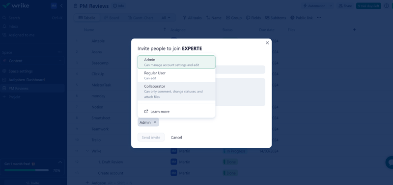 | Wrike | ClickUp | Teamwork | monday | Asana | Airtable | Smartsheet | Notion | Trello | Basecamp | MeisterTask | |
