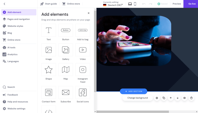 Optically, this is very similar to Wix and just as easy to master. The most important menu is off to the left and includes all of the tools you'll need to edit your website. By clicking on its icons, you can add new elements and pages, adjust your website's style, create a blog, and manage your online store's products.